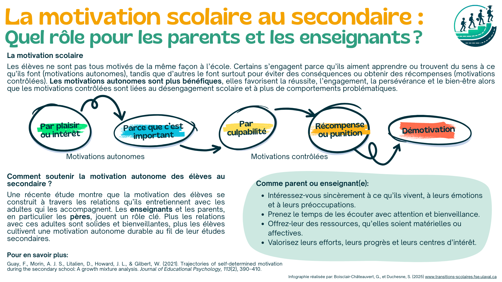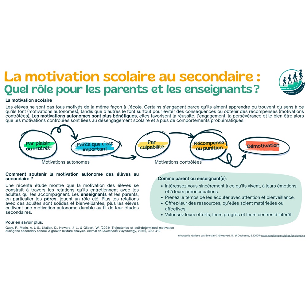 Pour en savoir plus: Guay, F., Morin, A. J. S., Litalien, D., Howard, J. L., & Gilbert, W. (2021). Trajectories of self-determined motivation during the secondary school: A growth mixture analysis. Journal of Educational Psychology, 113(2), 390–410.