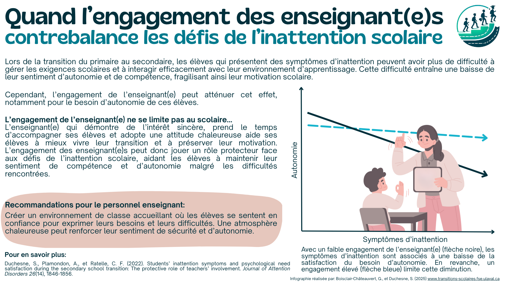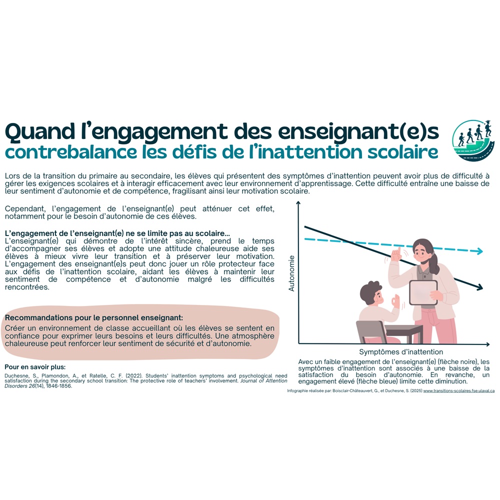 Pour en savoir plus: Duchesne, S., Plamondon, A., et Ratelle, C. F. (2022). Students’ inattention symptoms and psychological need satisfaction during the secondary school transition: The protective role of teachers’ involvement. Journal of Attention Disorders 26(14), 1846-1856.