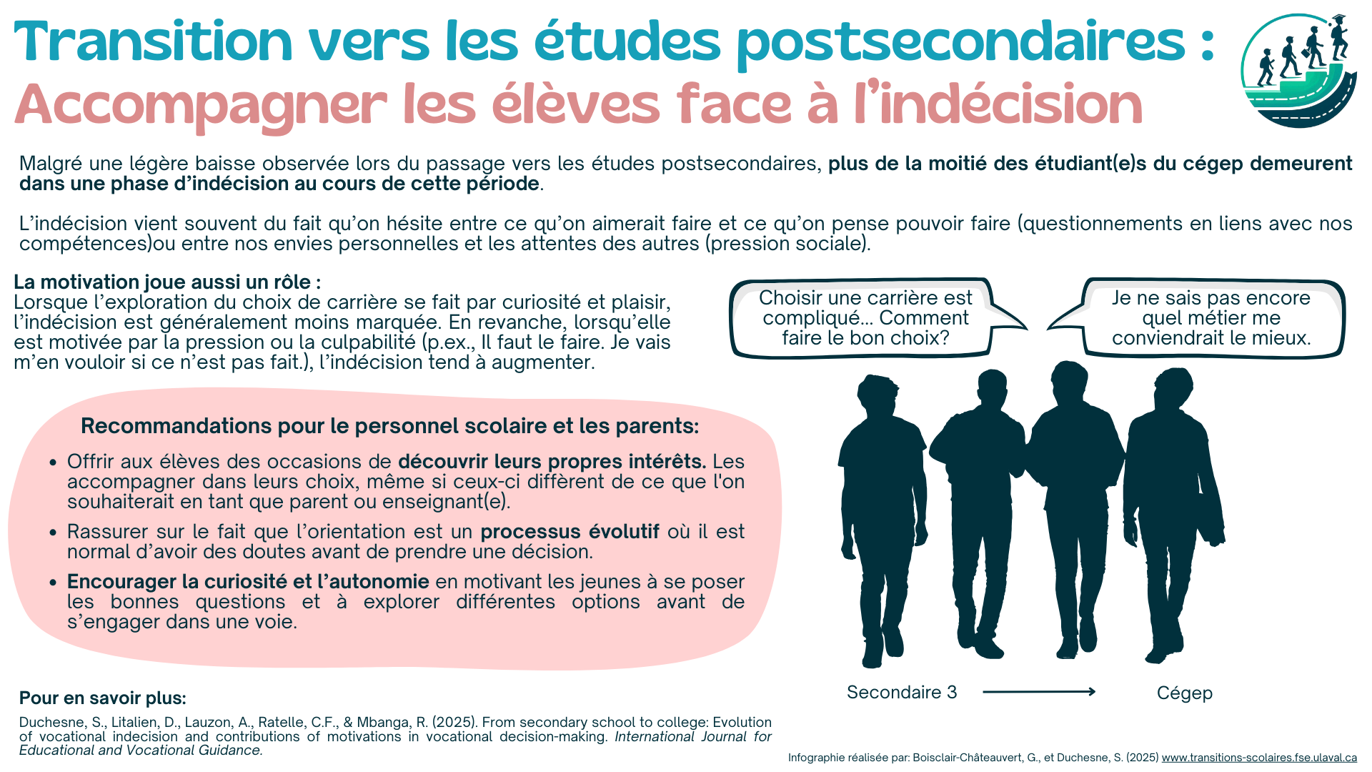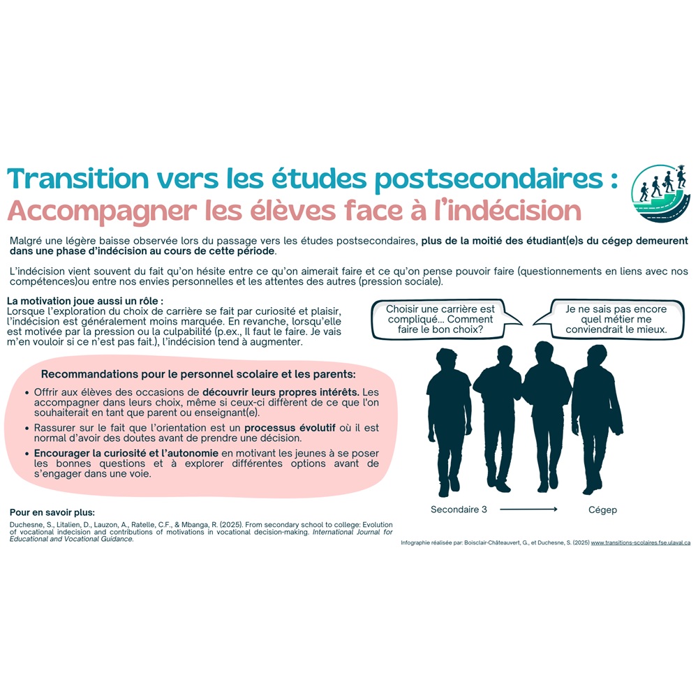 Pour en savoir plus: Duchesne, S., Litalien, D., Lauzon, A., Ratelle, C.F., & Mbanga, R. (2025). From secondary school to college: Evolution of vocational indecision and contributions of motivations in vocational decision-making. International Journal for Educational and Vocational Guidance.