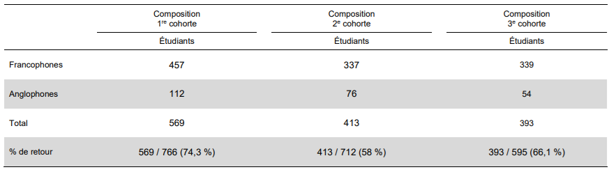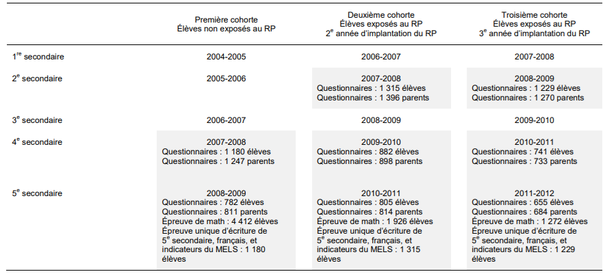 Ce sont 3 724 élèves (cohorte 1: élèves non exposés au RP et ayant fait leur entrée au secondaire en 2004-2005; cohorte 2 et 3: élèves exposés au RP et ayant fait leur entrée au secondaire en 2006-2007 et 2007-2008 respectivement) et 3 913 parents qui ont participé à ce projet. Les données ont été recueillies alors que les élèves étaient inscrits en 2e secondaire (cohorte 2 et 3 seulement), 4e secondaire, 5e secondaire ainsi qu’à la 1re et à 4e session du collégial.
